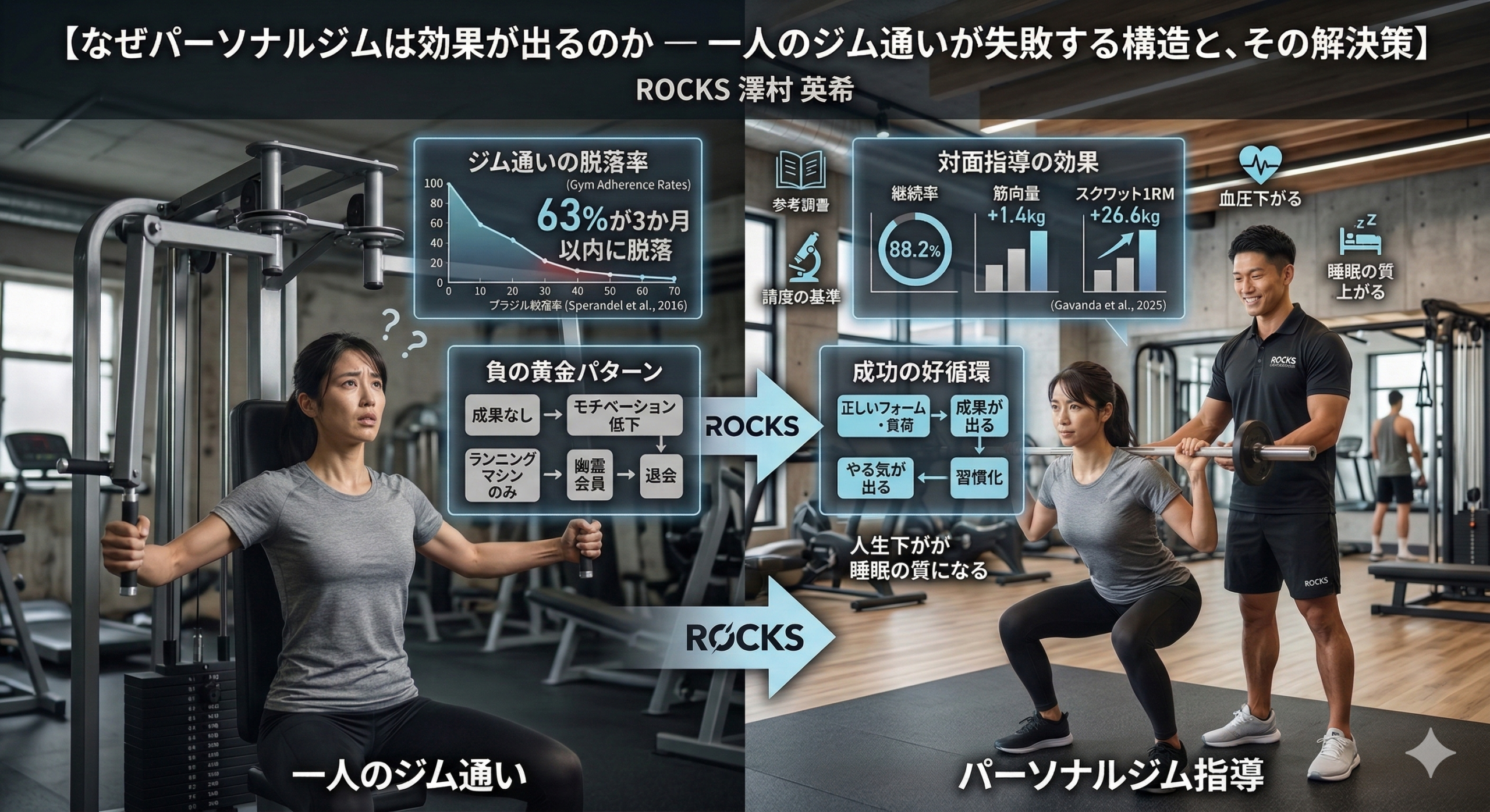 トレーニングに関する海外を中心とした研究論文と、ROCKS会員様の実データをエビデンスとしたブログを発信しています。少し長くなりますがご覧ください。