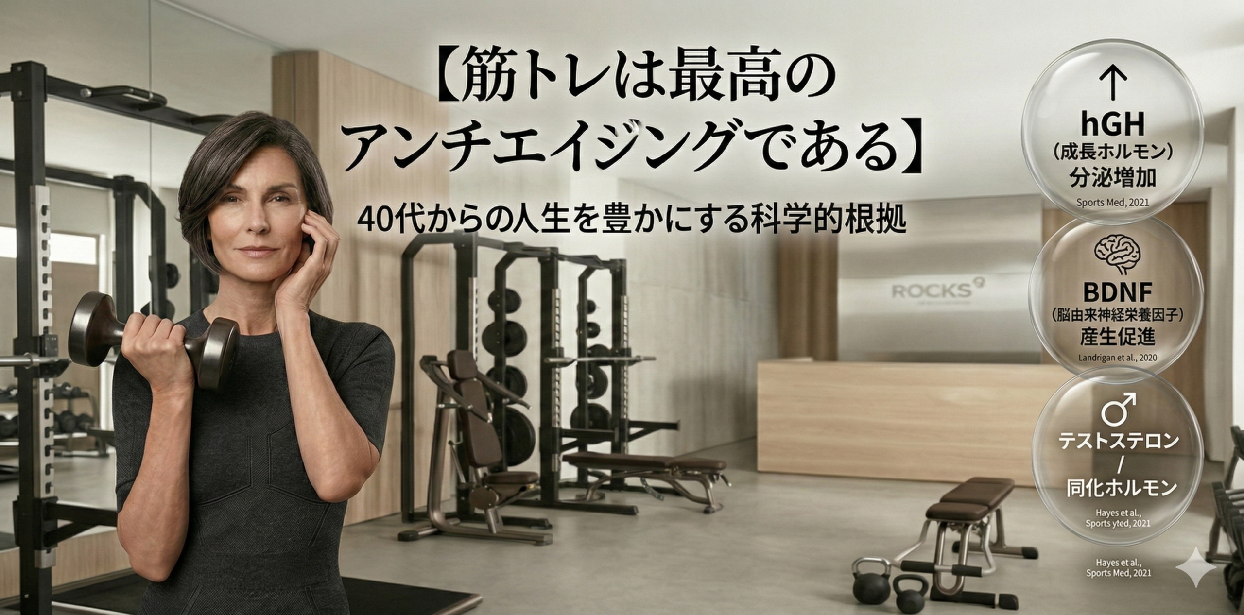 2021年にSports Medicine誌に掲載された系統的レビューでは、40歳以上の男女において、筋トレを含む運動によって成長ホルモン(hGH)、テストステロン、IGF-1(インスリン様成長因子)、DHEAといった同化ホルモンの基礎分泌量が有意に増加したことが報告されています(Hayes et al., Sports Med, 2021)。