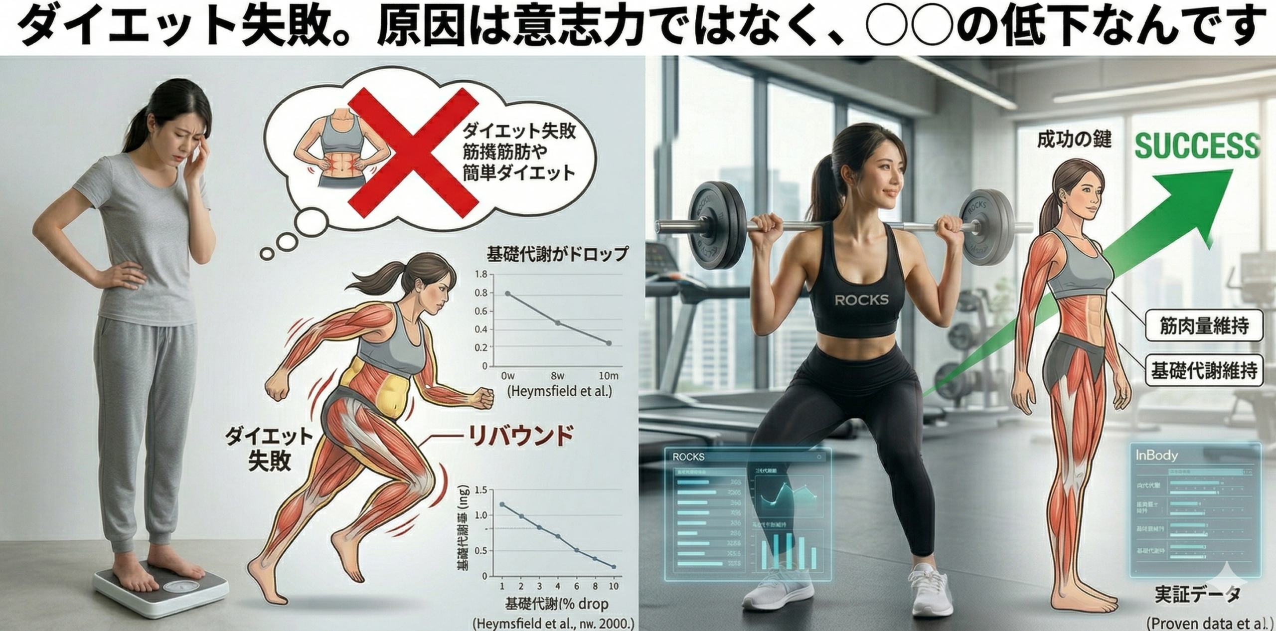 筋トレと高たんぱく質食で筋肉を守りながら脂肪を落とすことが、リバウンドのループから抜け出す唯一の方法です。